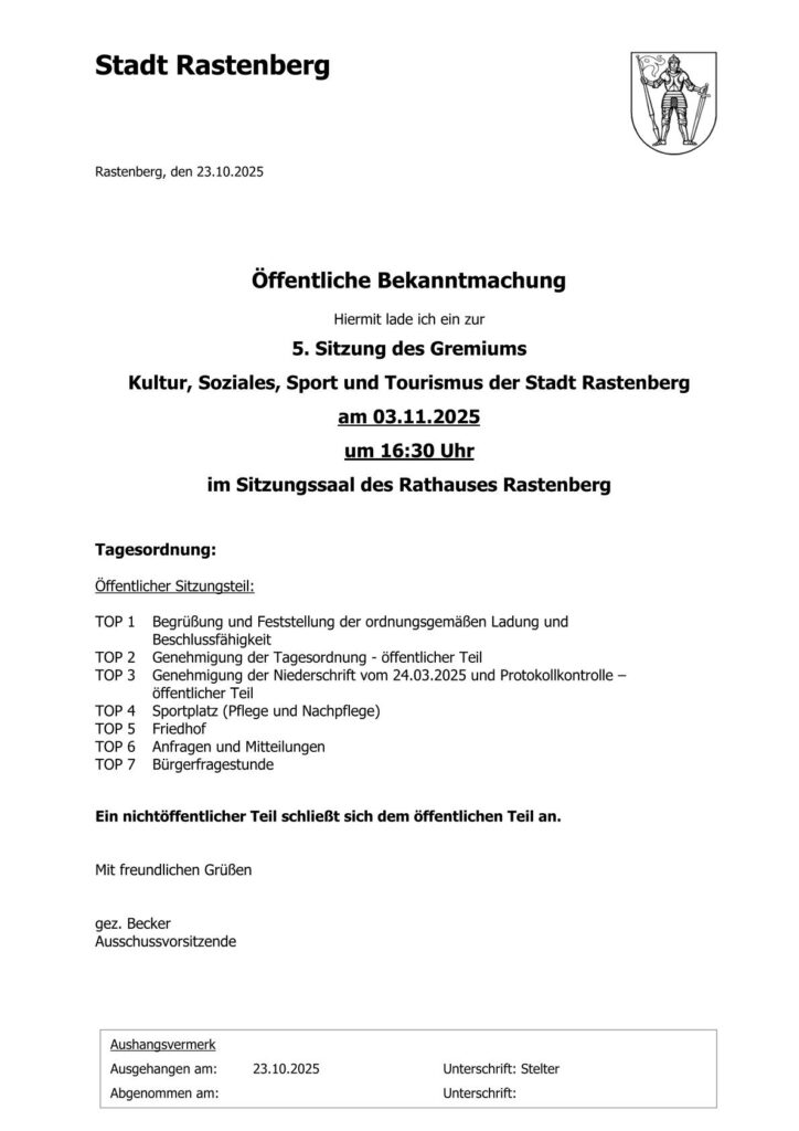 03.11.2025 | 5. Sitzung des Ausschusses für Kultur, Soziales, Sport und Tourismus der Stadt Rastenberg Öff. Bekanntmachung Rastenberg