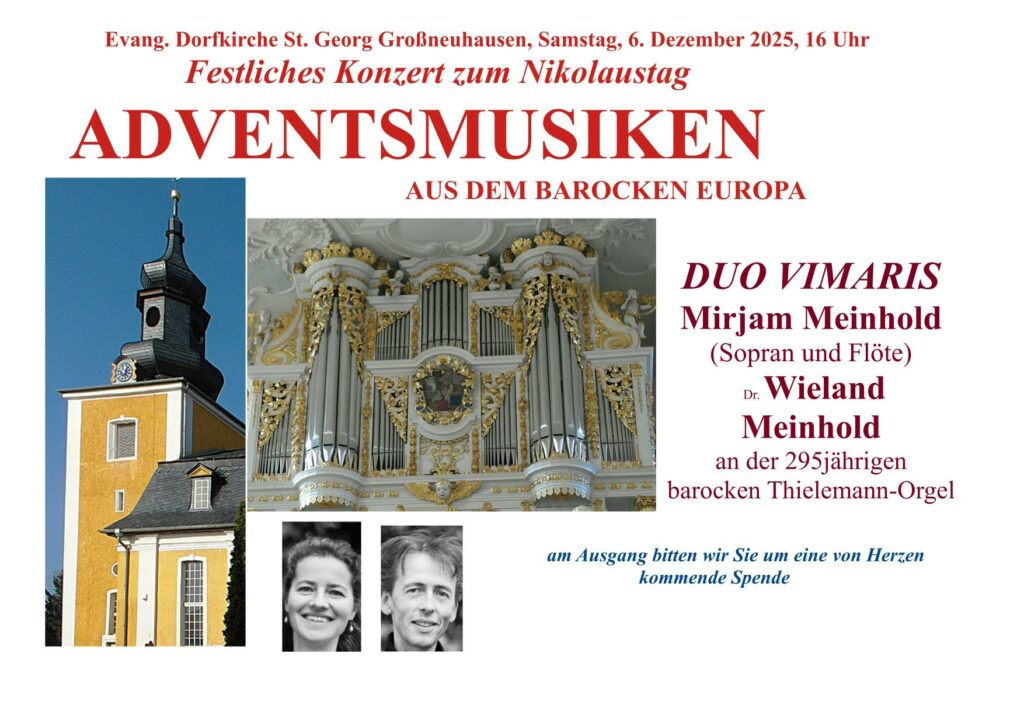 Zum Nikolaus-Samstagnachmittag, 6. Dezember 2025 um 16 Uhr lädt Duo Vimaris, bestehend aus Mirjam Meinhold (Sopran und Blockflöten) und Wieland Meinhold (an der barocken Thielemann-Orgel von 1730), zu einem stimmungsvollen Adventskonzert in die Dorfkirche St. Georg Großneuhausen ein. Unter dem Titel „Advents-Musiken aus dem barocken Europa“ erwartet die Zuhörer ein facettenreiches Programm aus Werken bekannter europäischer Komponisten des Barock. Die musikalische Reise führt durch verschiedene europäische Länder und spiegelt die adventliche Festlichkeit und Besinnlichkeit wider. Zu hören sind unter anderem Stücke von Johann Sebastian Bach, weihnachtliche Lieder aus dem Schemelli-Gesangbuch, die festliche Pastorale von Domenico Zipoli sowie das bewegende „Tochter Zion, freue dich“ von Georg Friedrich Händel. Das Programm umfasst viele weitere Komponisten und traditionelle Weihnachtslieder aus Böhmen, Portugal und anderen Ländern, die dem Konzert eine internationale Note verleihen. Mit der Moderation von Wieland Meinhold, der klangvollen Stimme von Mirjam Meinhold und ihrer musikalischer Begleitung mit Blockflöte und Orgel verspricht das Duo ein eindrucksvolles Adventserlebnis. Der Eintritt ist frei, um eine von Herzen kommende Spende wird herzlich gebeten.