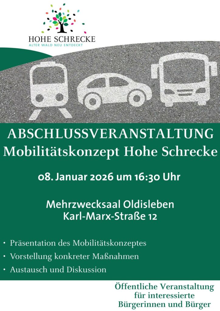 Der Verein Hohe Schrecke lädt alle Interessierten herzlich zur öffentlichen Abschlusspräsentation des Mobilitätskonzeptes für die Region Hohe Schrecke ein. Die Veranstaltung findet am 08. Januar 2026 um 16:30 Uhr im Mehrzwecksaal Oldisleben, Karl – Marx – Str. 12 statt.