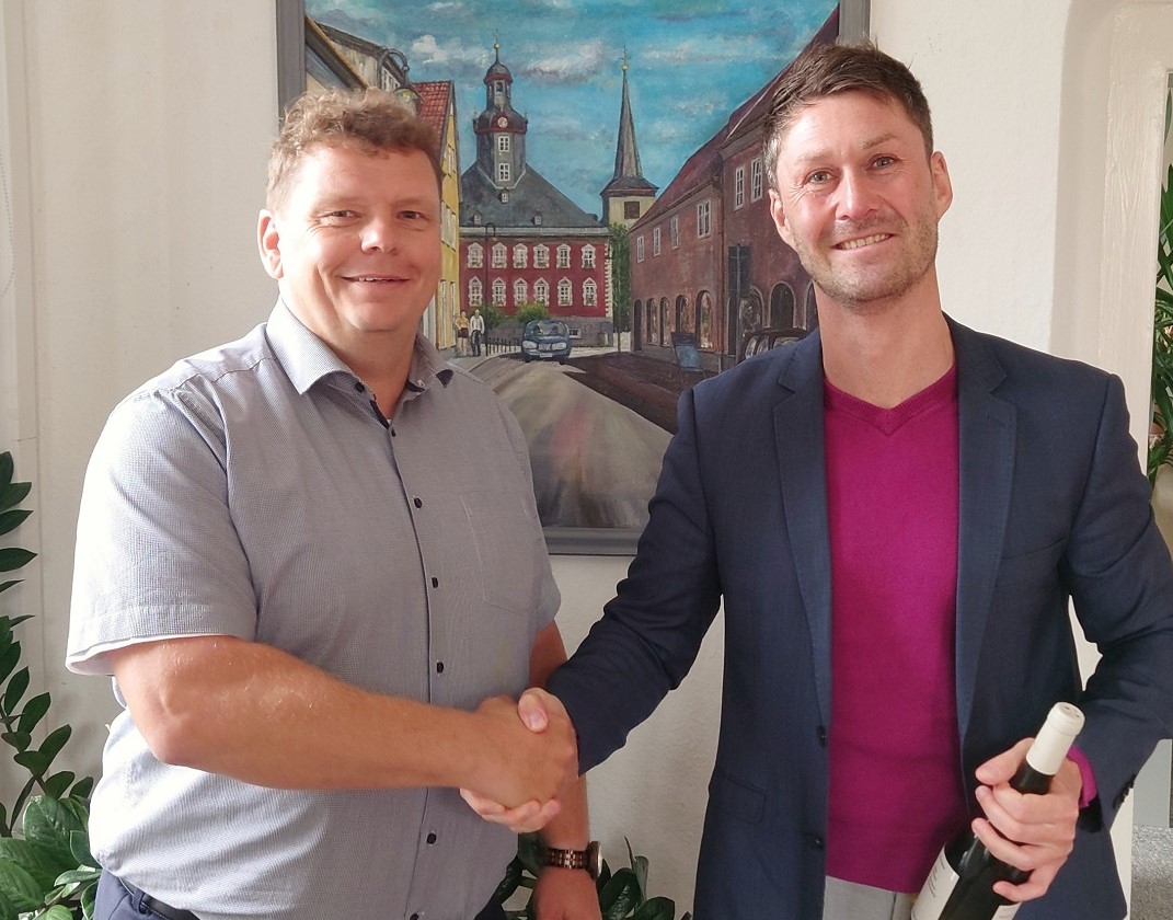 Sebastian Goldhorn, Gemeinschaftsvorsitzender der VG Kölleda, ließ es sich nicht nehmen, den neuen hauptamtlichen Kölledaer Bürgermeister Uwe Kraneis im Amt zu begrüßen. Als kleinen Willkommensgruß gab es eine Flasche Wein vom Weimarer Poetenberg.
