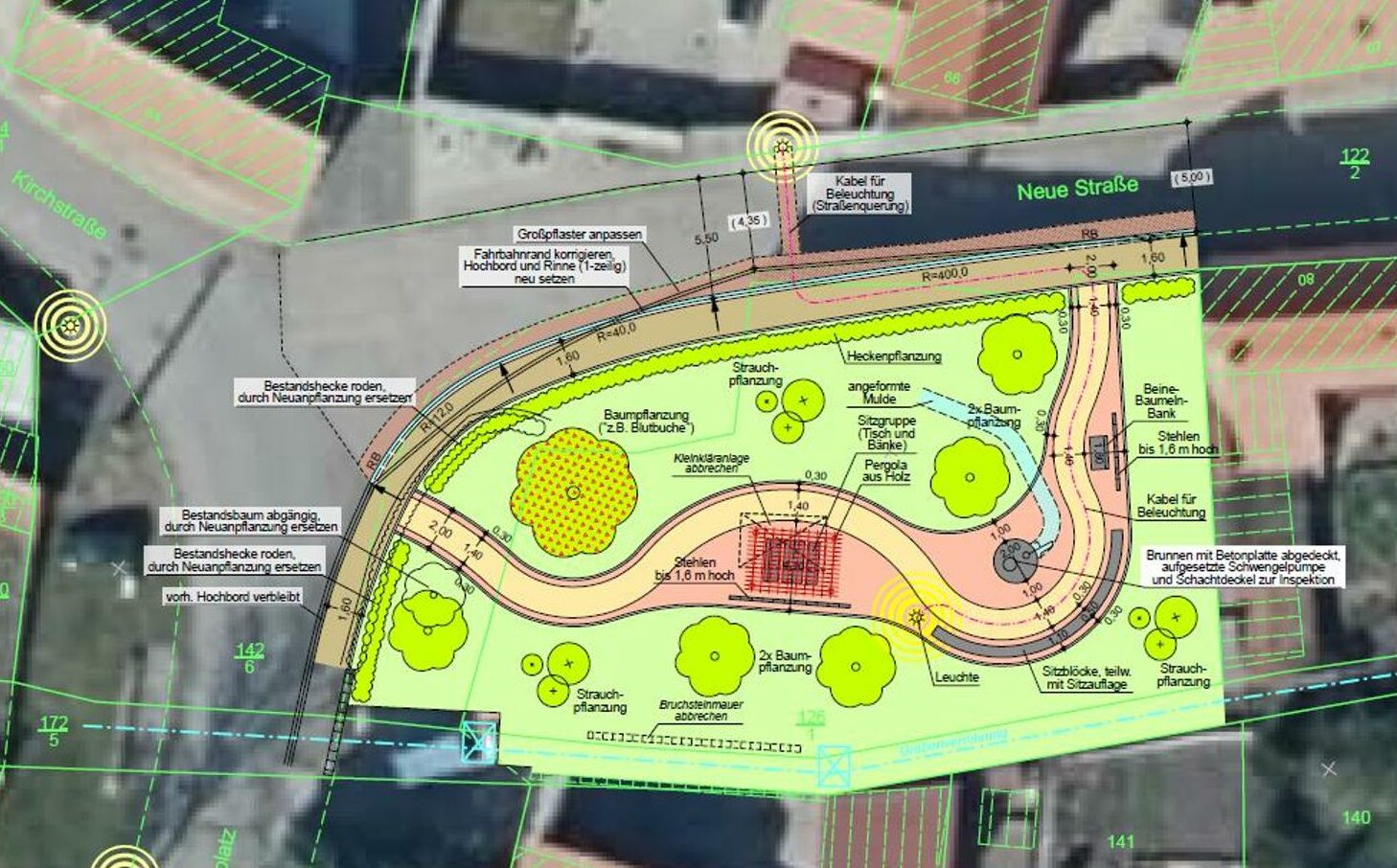 Die entstandene Baulücke soll nun als Platz gestaltet werden. Im Herzen der Platzgestaltung ist der vorhandene Brunnen, welche von einer halbkreisförmigen Sitzgruppe überdacht von einer Pergola umschlossen wird. Weiterhin wird eine Sitzgelegenheit (zwei Bänke ein Tisch) mit Sonnensegel überspannt, welche dadurch auch an heißen Tagen zu Verweilen einlädt. Bücher in einer umfunktionierten Telefonzelle können auf der „Bein-Baumel-Bank“ entspannt gelesen werden. Der Platz wird mit einer Blutbuche und weitern Bäumen bepflanzt, so dass durch den Schatten der Bäume und dem Wasser aus dem Brunnen ein angenehmes Mikroklima entstehen wird.