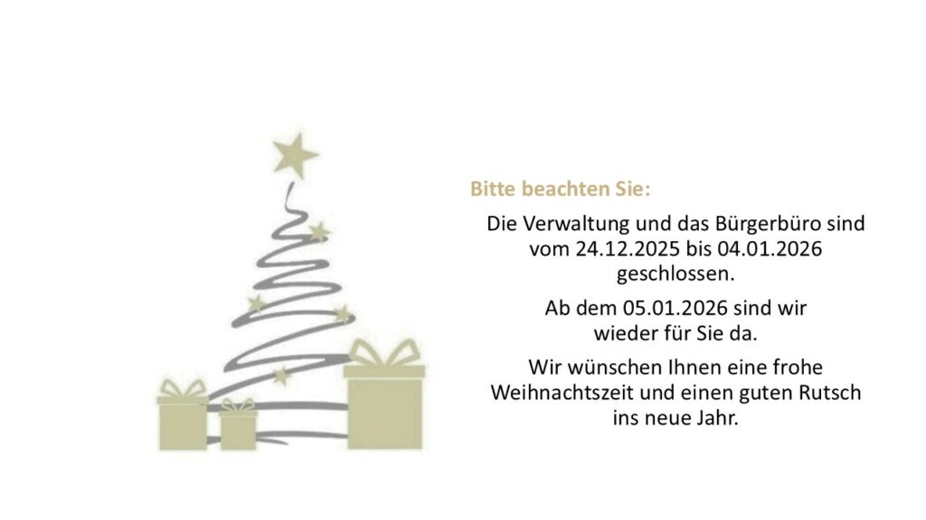 Die Stadtverwaltung, VG Kölleda und das Bürgerbüro sind vom 24.12.2025 bis 04.01.2026 geschlossen.