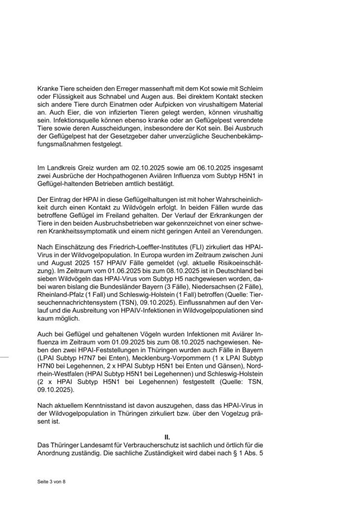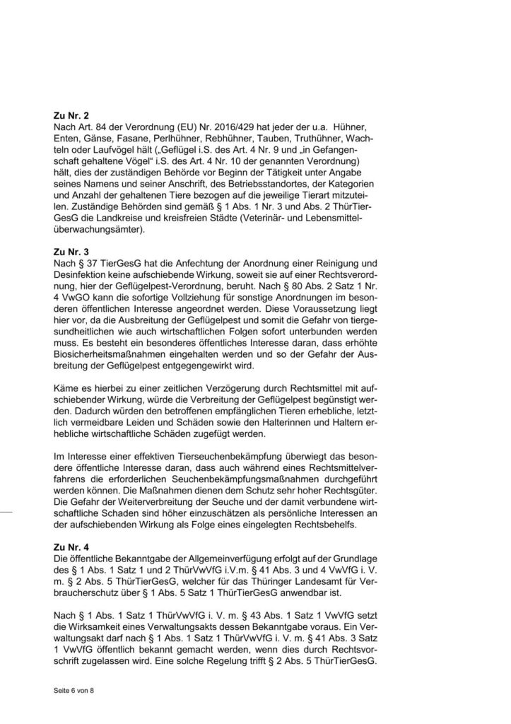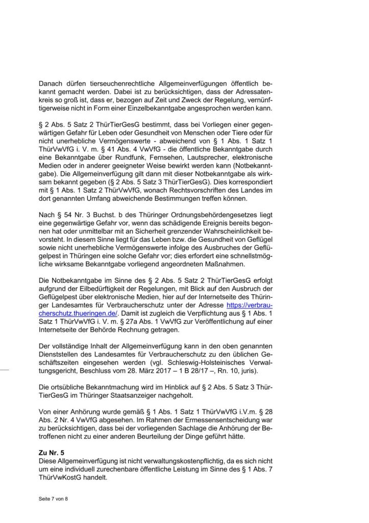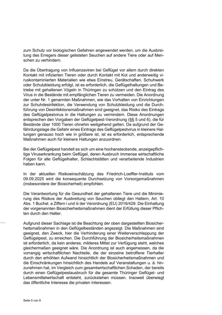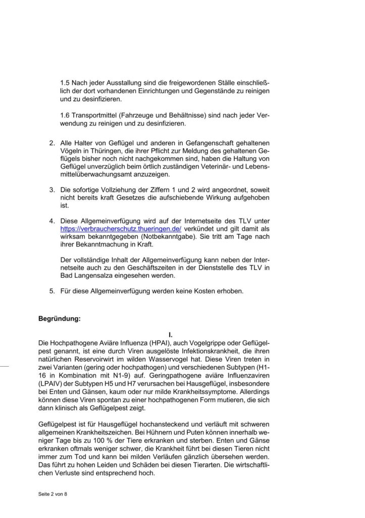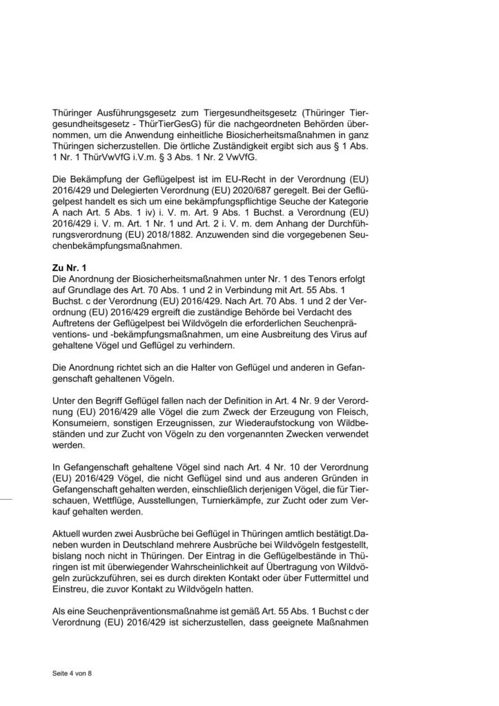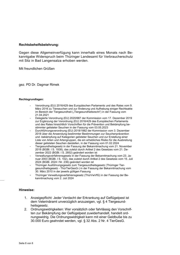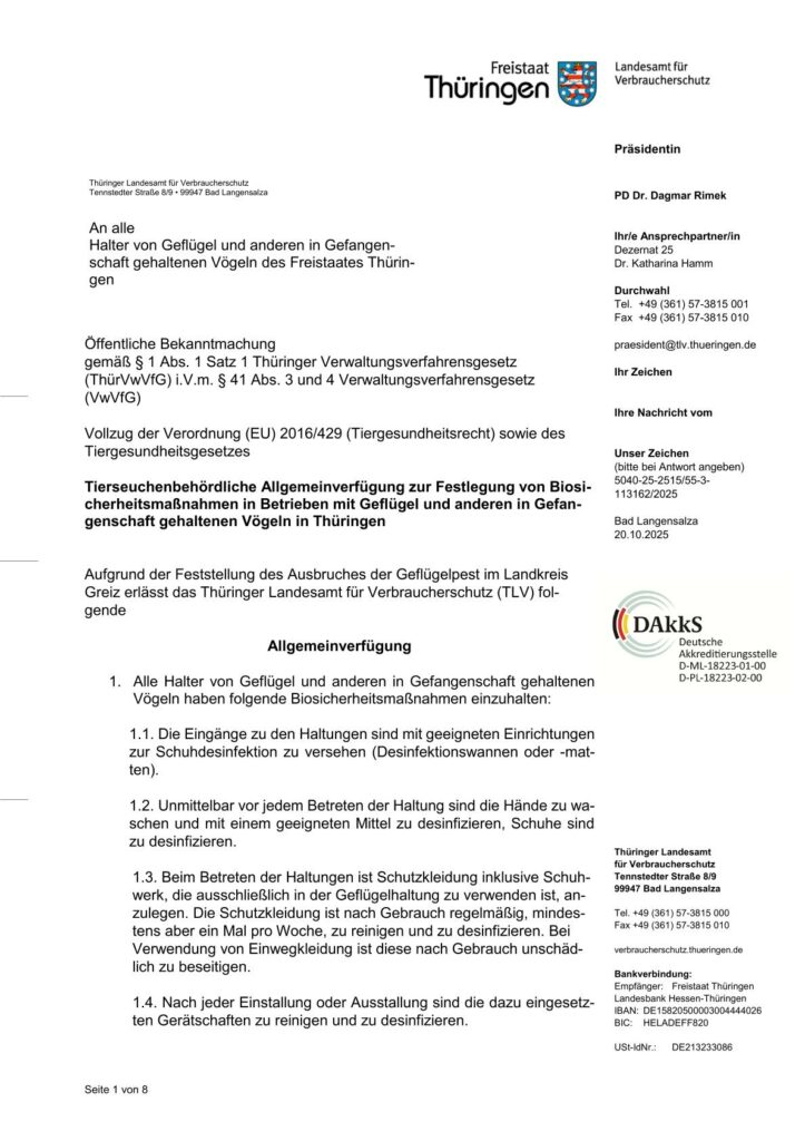 Tierseuchenbehördliche Allgemeinverfügung zur Festlegung von Biosicherheitsmaßnahmen in Betrieben mit Geflügel und anderen in Gefangenschaft gehaltenen Vögeln in Thüringen Öff. Bekanntmachung VG Kölleda VG | Information