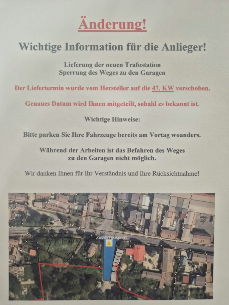 Lieferung der neuen Trafostation – Sperrung des Weges zu den Garagen